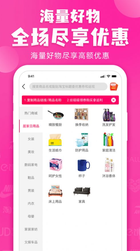 省喵喵app是一款提供优惠购物的手机商城软件,每天在线就可以免费的领取到不同的商品优惠券,能够立享折扣,省去不少的开销,邀请自己的好友来这里下单购物还能够获得返利的奖励,惊喜福利多多,千万不要错过,商城内的商品都是大牌保真,可以放心购买!