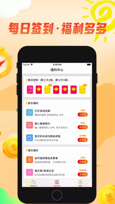 1、更省钱的社交电商平台,每天早起打卡领红包,做任务,拿福利,更多网购优惠尽在其中。