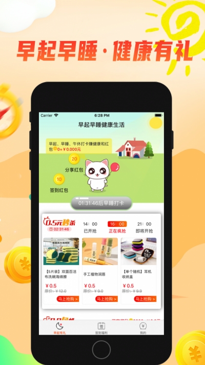 3、社交电商生活工具,一日之时在于晨,鼓励用户养成早起习惯,早起的鸟儿有虫吃,早起的人在平台上不仅可以打卡免费领红包、还能在早晨7点、8点享受0.5元秒杀商品。
