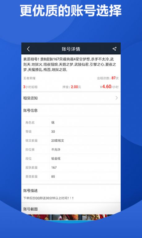 1、这里有非常多的优质游戏账号出租,如果你也是王者、LOL、CF游戏的玩家,可以在这里找到非常多的优质游戏账号。