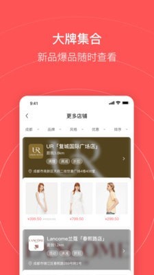 2、专注于服饰和美妆领域,聚合品牌线下实体门店,根据LBS定位系统,为用户呈现全城优惠信息与附近购物优选指南。