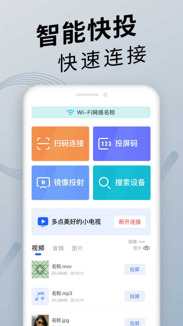 2.在自动完成与电视的连接后,用户能完美的将手机上的视频、音乐、照片一键投屏到电视上进行观看,获得更完美的视听体验;