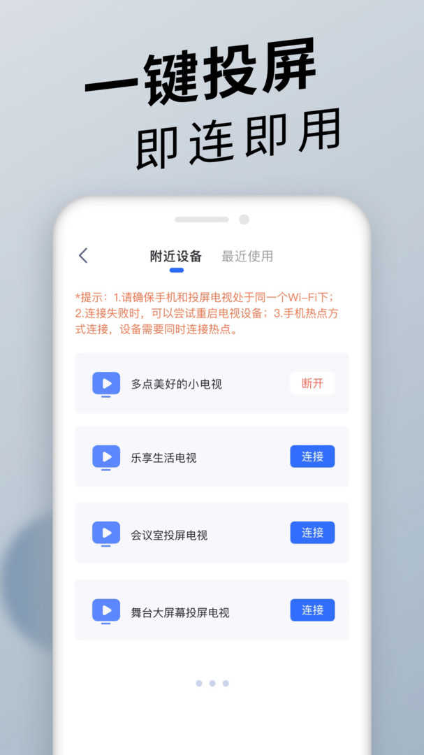 1.能自动搜索到同一wifi环境中的安卓智能电视(电视端无需安装额外的APP应用),并自动完成连接;