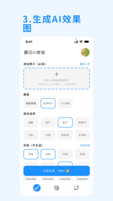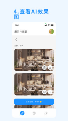 晨羽AI效果图app是一款非常实用、高效的室内设计软件,能够为用户节省时间成本,提供高质量的设计方案,能够帮助用户将想象中的设计理念转化成为具有可视化效果的图片,如果您需要一个快速、便捷且高有效率的室内设计软件,晨羽AI效果图将是您的首选。