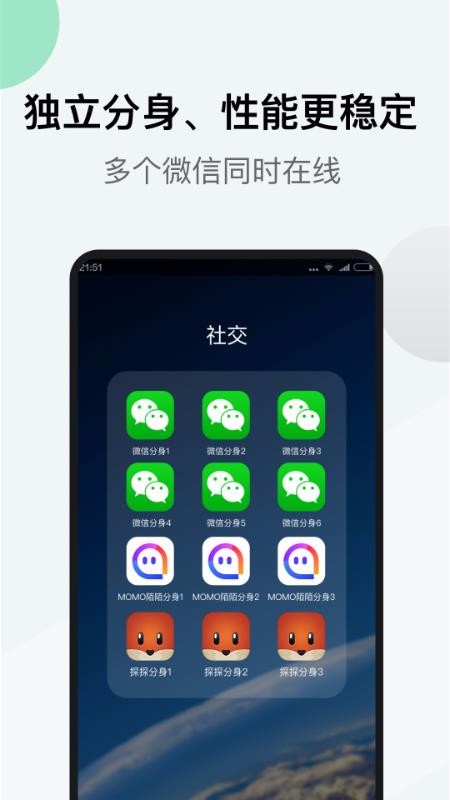 3、轻松免 费实现微信双开,微信多开,微信分身:告别多个微信账户来回切换的烦恼;一部手机,多个微信账号同时在线,放肆分享,放肆聊天