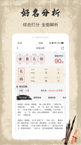 2、一键快速测名,知道名字的质量,便于对名字进行打分,并进行名字修改的意见;