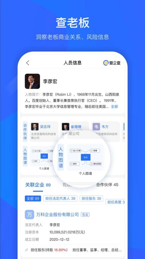 5、查看老板的信息,可以详细的查看老板的关联企业以及合作伙伴和人物图谱等;