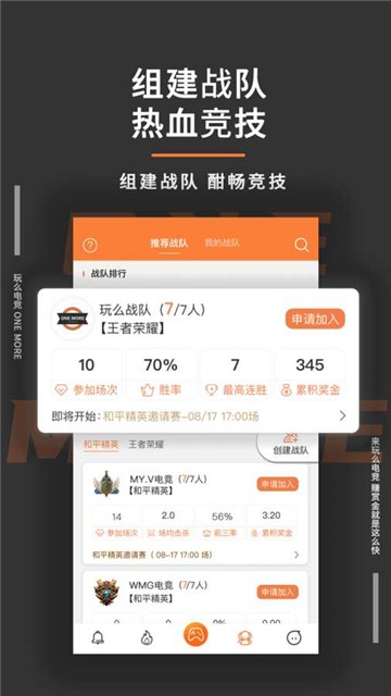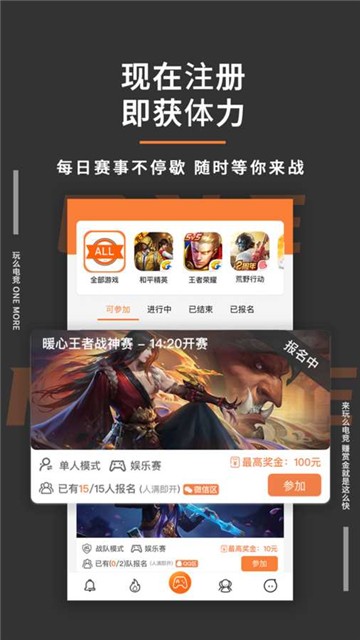 玩么电竞是一款集合王者荣耀、和平精英、决战平安京、荒野行动、使命召唤手游、地下城与勇士手游、英雄联盟手游等热门游戏的电竞赛事APP。玩么电竞打破传统电竞模式、奖金方式、赛制模式,消除地域限制、实力水平等门槛,真正做到人人皆可参与,人人都能获奖,人人都是冠军!