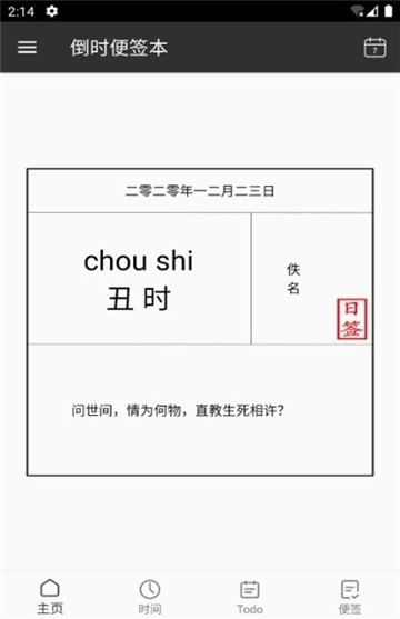 倒时便签本,简约中国风的古典记事工具。在这里你可以设置一个倒计时的时间,加以笔记承载,主页界面随机更新,为你带来各种古典文学的代表佳作名句,随时还可以学会各种古代的时辰表达方式,对于喜欢这类古典文化的朋友而言是非常不错的记录app的选择。