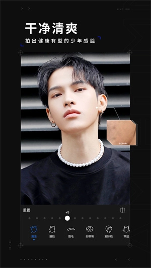 2、实时预览面部清洁度、健康肤色和时尚轮廓。微调面部细节,还原少年时代的真实效果。