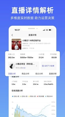 3、支持实时监控带货直播业务的关键指标,包括观看人数、销售额、订单量等。
