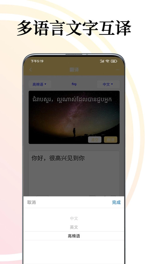 1、语音识别功能的翻译软件,可准确识别柬埔寨语口音和方言。
