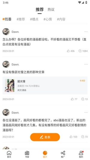 3、添加自己喜欢的漫画到自己的书架里面的就可以轻松的进行追漫画,自动提醒更新。