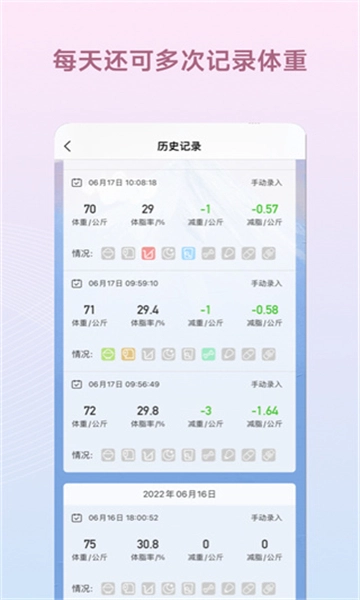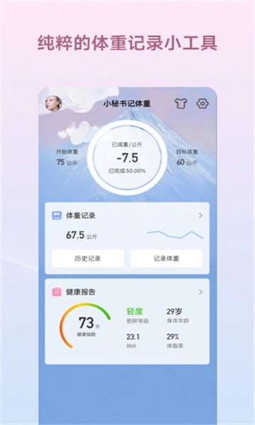 减肥小秘书易用可靠的减肥软件,那么减肥小秘书将是你的最佳选择。它可以帮助你全面掌控自己的体重,并提供专业的指导和建议,让你轻松减肥并保持身体健康。下载减肥小秘书,让你更快地摆脱肥胖困扰!该软件具备完善的体重记录工具,能够让你清晰地了解自己的体重变化情况,让你更加了解自己的身体状况。