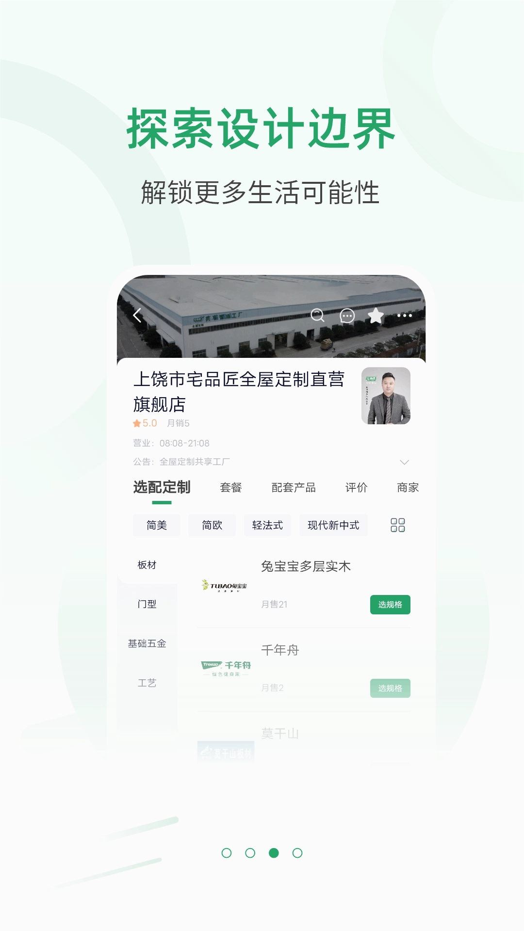 宅品匠是一款专门为新房装修用户打造的私人定制服务平台。宅品匠软件提供全方位的定制服务,根据用户的需求和喜好,提供个性化的装修方案、家具搭配建议以及装饰风格推荐,让用户获得满意的装修效果。为用户提供工艺施工监督服务,确保装修过程中施工质量和进度的把控,提高装修效果和施工质量。