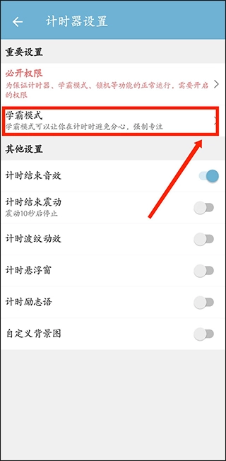 4、在【计时器设置】中找到【学霸模式】,点击打开即可开启。
