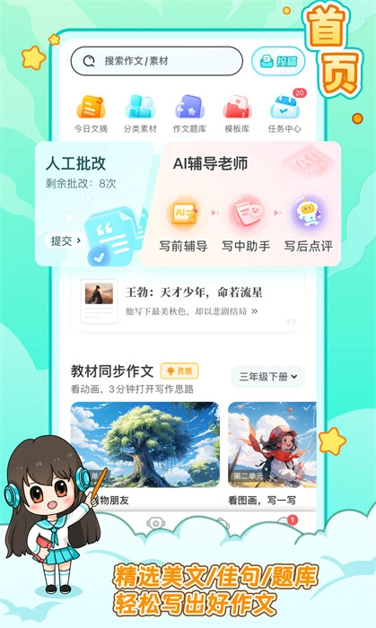 平台配备了海量的作文与素材资源库,内容覆盖范围广泛,能够适配不同学习阶段的用户,并满足各类主题的使用需求。