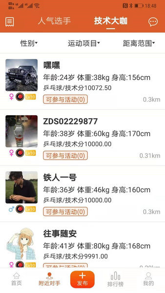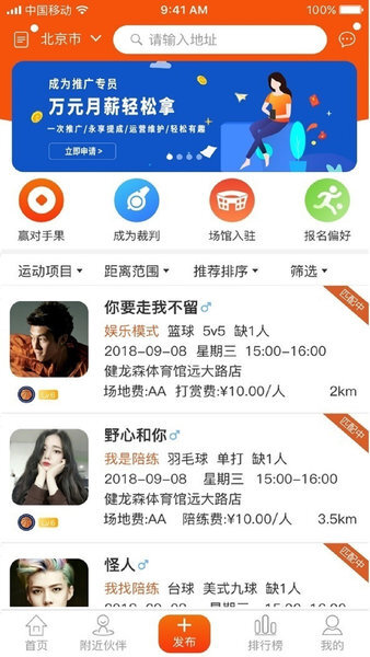 随时随地找到心仪的运动对手、运动伙伴;