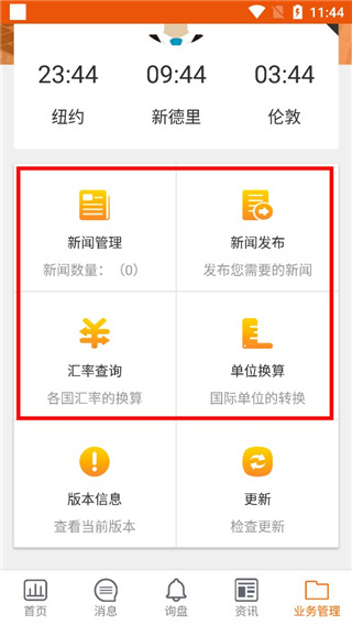 点击进入业务管理界面后,在头像下方可以看到三个国外地区的时间,需时刻留意。