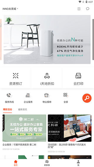 软件【首页】呈现的是若干常用功能,像资源预订、i天地折扣、云打印之类,下方还设有精彩活动与最新资讯板块。