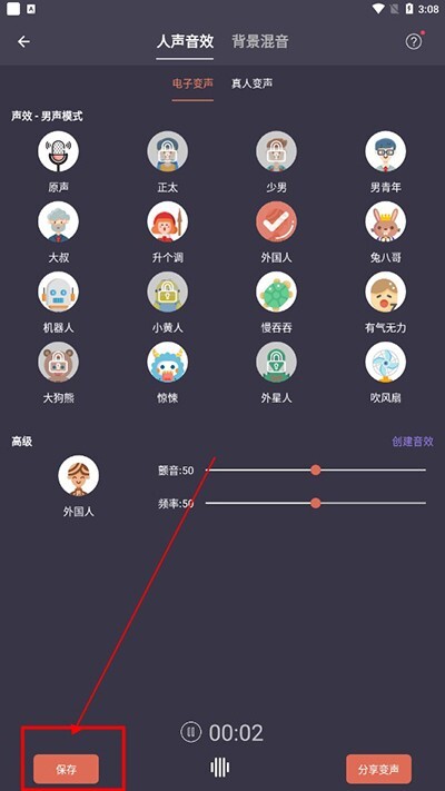 用户只需选中想要设置的变声音效,就能点击底端按钮将变声后的音频保存为文件,整个操作十分方便快捷。