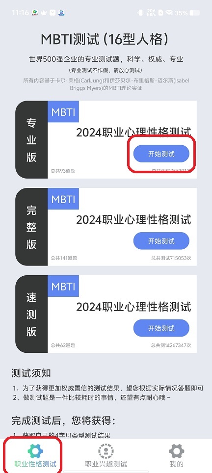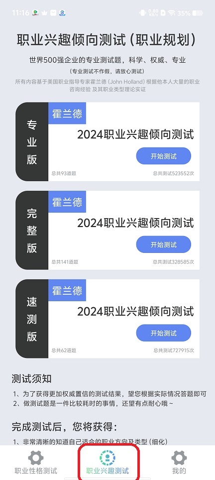 在职业兴趣测试界面,查看自己的性格和兴趣。