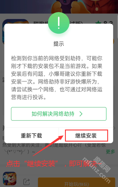 有用户反馈,在尝试通过“快爆工具服务”启动“快玩/云玩游戏”时,可能会碰到无法正常进行的情况,具体会出现提示“重试”或者网络劫持错误,进而造成安装失败(如下图)。要是遇到这类状况,用户可以临时点击弹窗里的“继续安装”按钮来处理该问题。问题的具体表现如下: