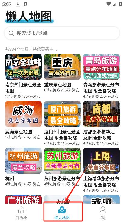 在“懒人地图”板块下,目前已有近800张覆盖全国各地的地图,并且还在持续更新。用户能够直接搜索地名来查看相关地图攻略,其中涵盖了国内外的旅游城市。
