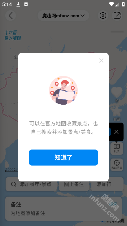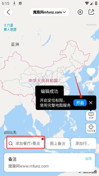 若需使用完整地图功能,需先开启定位权限,之后可根据自身需求添加餐厅或景点,还能为地图添加备注信息。