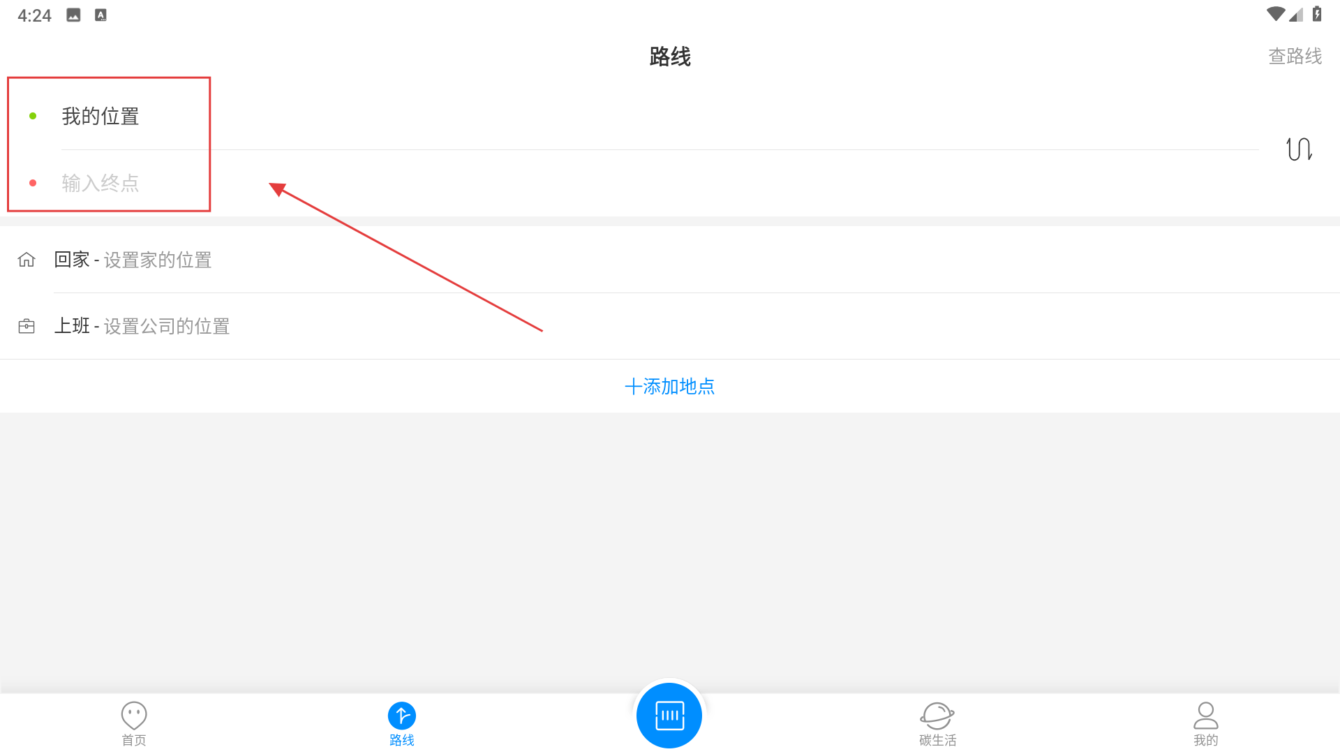 2、进入路线页面后,先确认【我的位置-起点】信息,再在【输入终点-输入框】中填写目的地内容。