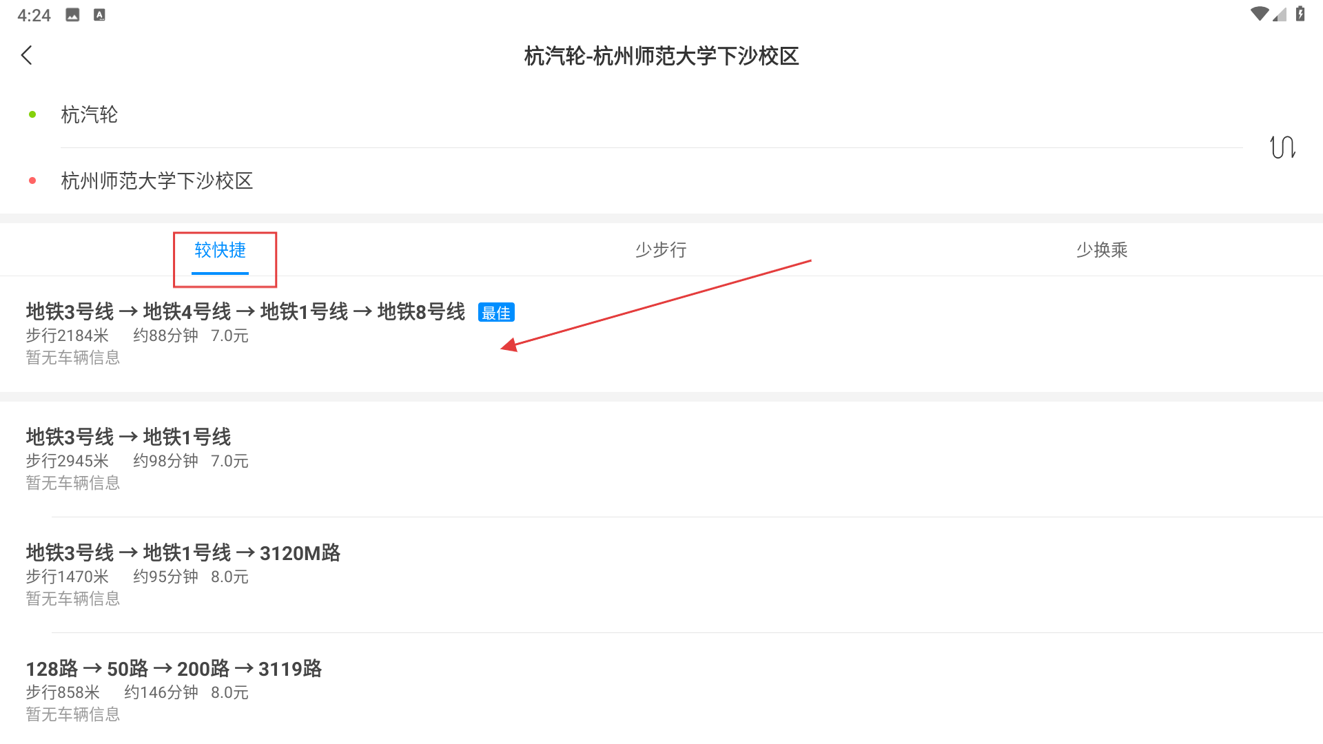 3、点击【较快捷-路线选项】,查看系统推荐的公共交通换乘方案。