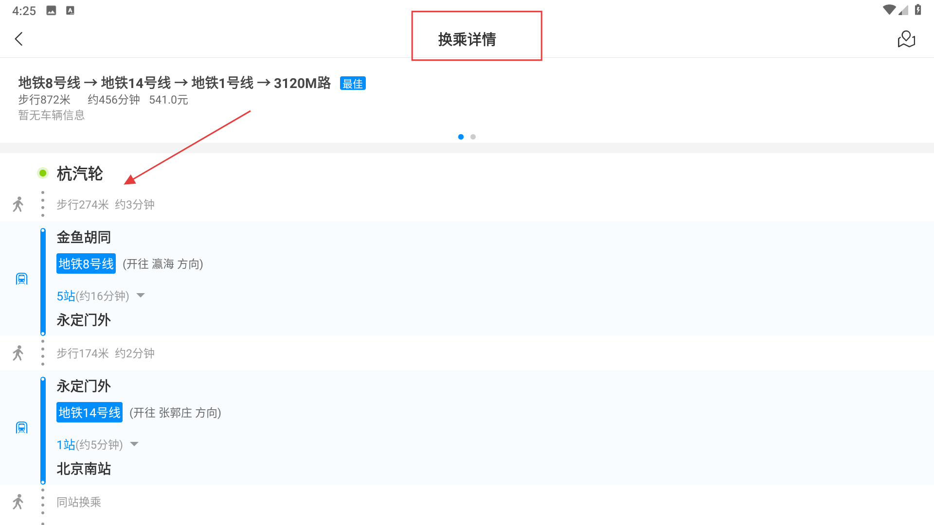 4、点击【换乘详情】按钮,查看步行、地铁及公交的具体换乘步骤。