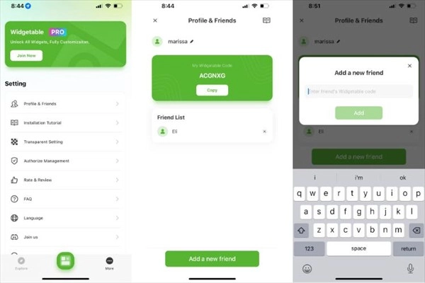 安装完成后,打开Widgetable应用,点击底部菜单栏里的“更多”选项,接着在弹出的菜单中选择“个人资料和好友”。之后,点击屏幕底部的“添加新朋友”按钮,并输入对方的代码即可。