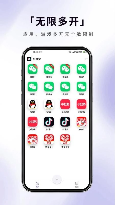 分身宝为用户日常多开手机应用提供了便捷方式,支持自由设置多开数量,方便用户日常独立管理使用,无论是多账号登录聊天、购物、看视频还是打游戏,都能在应用内实现,充分满足用户的各类使用需求;其应用界面十分干净简洁,所有功能一目了然,便于用户查看和操作,让用户享受贴心的服务体验!