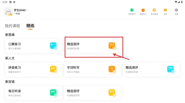 2、进入精练板块页面后,点击“精选测评”选项,即可查看测评列表。