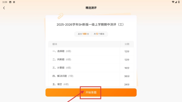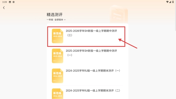 3、在测评列表中,点击“2025-2026学年SH新版一级上学期期中测评(三)”这一条目,即可进入测评详情页面。