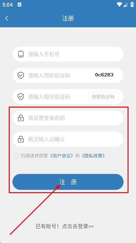 4、设置登录密码并再次输入以确认,勾选同意协议后,即可完成注册。