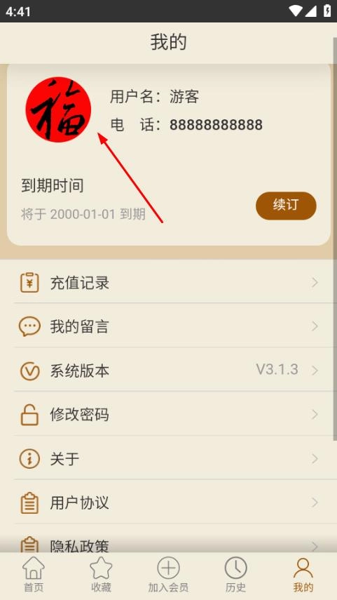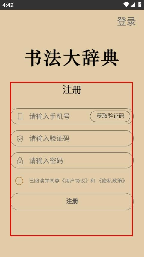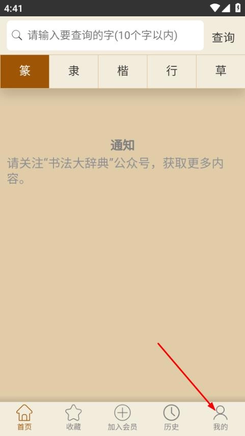 打开书法大辞典,点击页面底部的“我的”选项,即可进入个人页面。