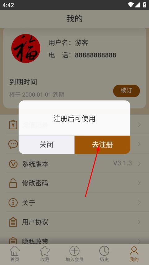 在个人页面,点击用户名区域,弹出注册提示框。