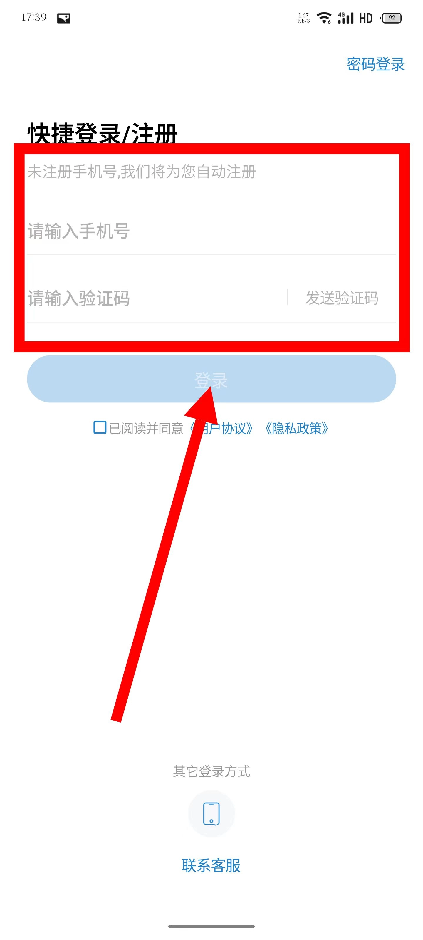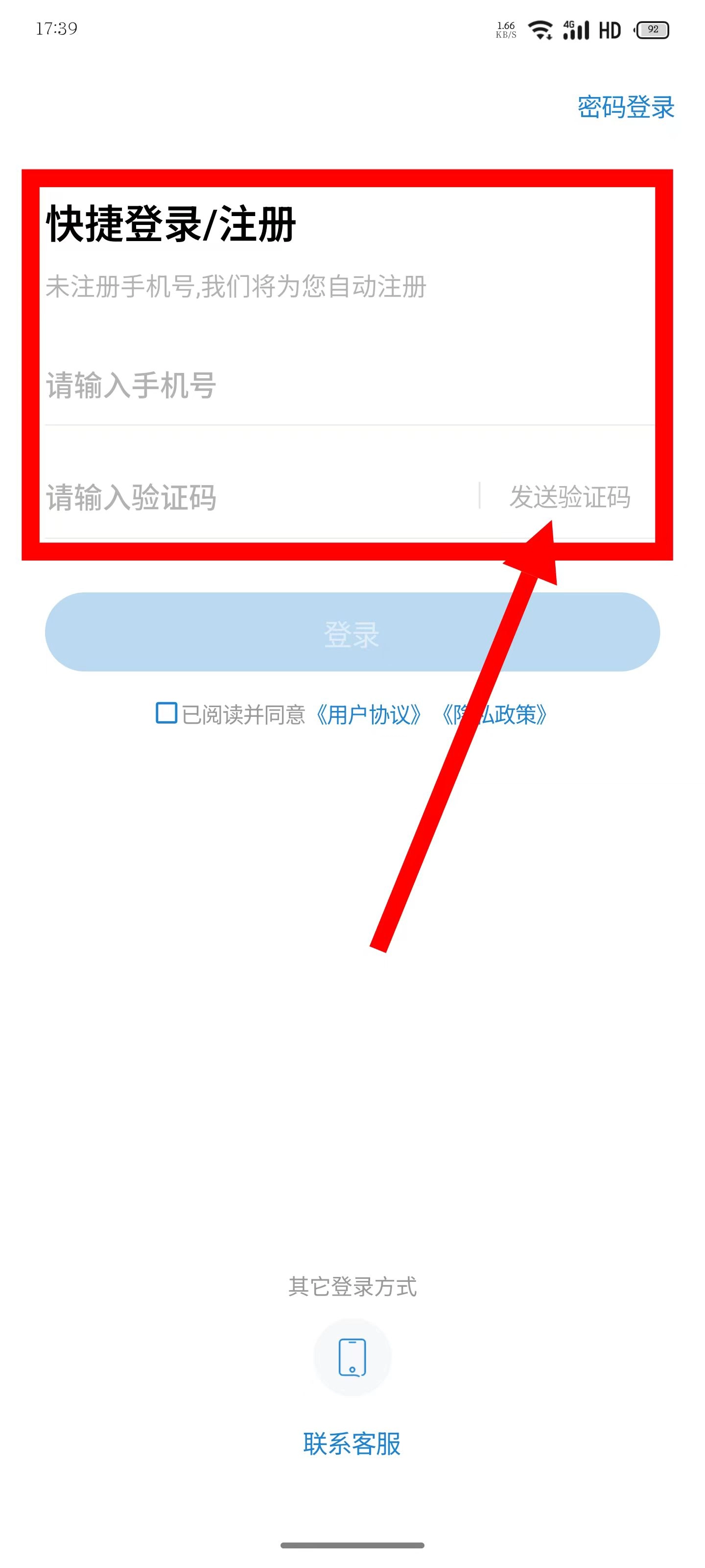 3、进入快捷登录注册界面后,填写手机号,再点击发送验证码按钮。