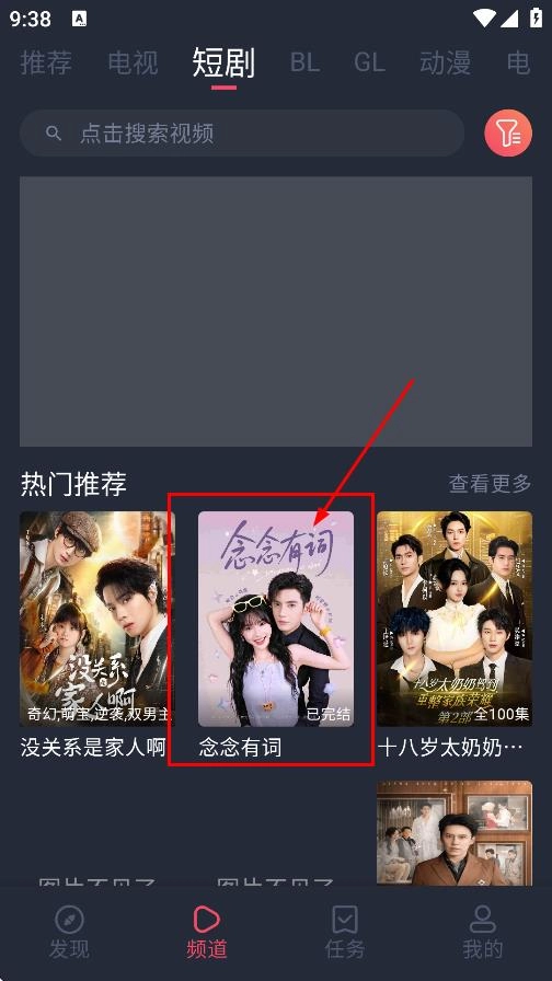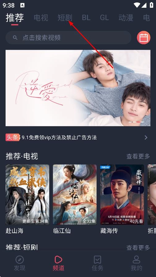 1、在频道页面,点击侧旁短剧,进入短剧分类页面。