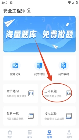 点击后会跳转到练习页面,接着点击“历年真题”,就能进入刷题界面开始做题了。