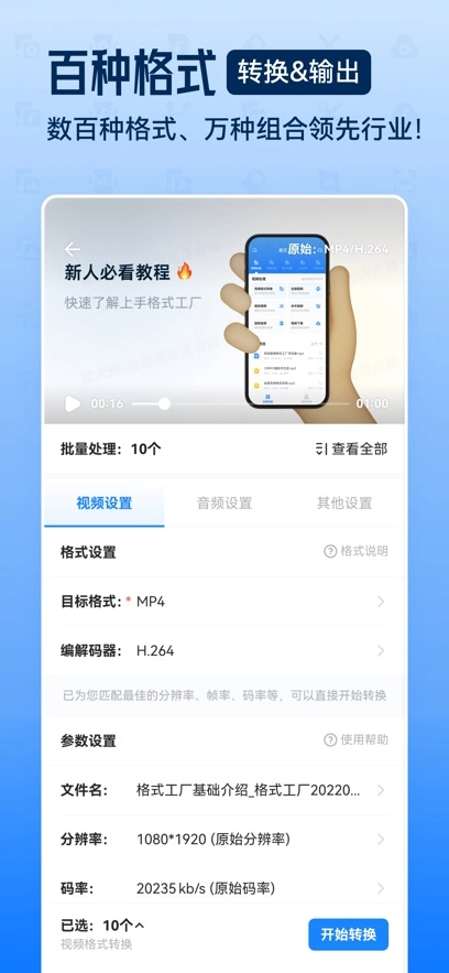 「视频格式转换」功能可实现全格式视频的任意转换,还能自主调整视频分辨率、码率、帧率等参数;支持转换的格式包括mp4、m4v、mkv、mpg、ts、mpeg、mov、wmv、asf、avi、vob、flv等。