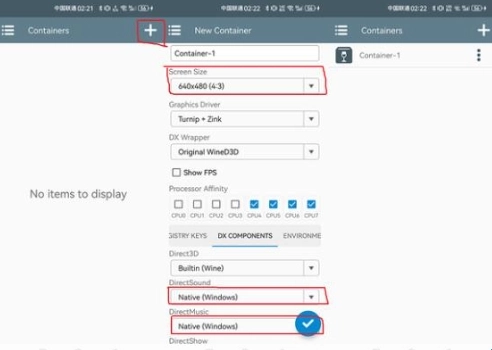2、在导入游戏之前我们需要创建一个容器,通过首页点击“+”创建,然后选项设置,这里需要根据你要导入的游戏来设置,例如分辨率大小、Direct sound和 Direct Music等,确保导入游戏后画面大小正常、背景音乐流畅运行;