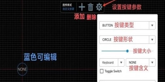 4、添加按键,按键会添加在十字准线所在位置,可以自行调节按键类型,按键含义,按键形状,按键大小。