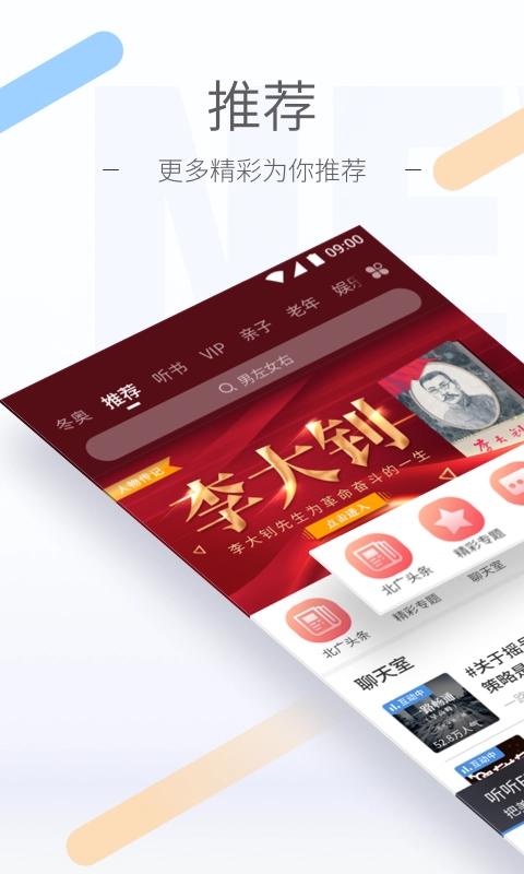 根据你的兴趣为你推荐优质音频节目,同时提供24小时热门资讯、音乐、脱口秀、情感心理、小说、综艺娱乐、评书、相声小品等24个垂直频道的订阅服务。