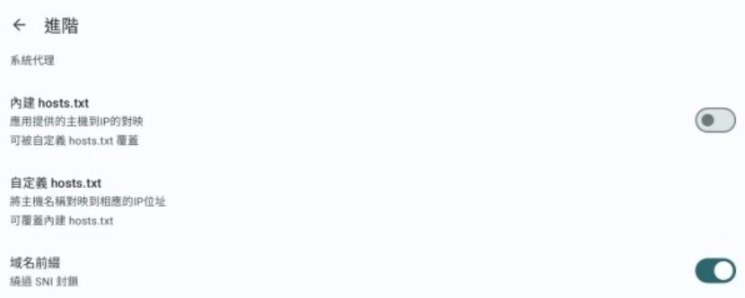 6、点击选择“进阶”选项,开启“hosts”和“域名前置”功能。