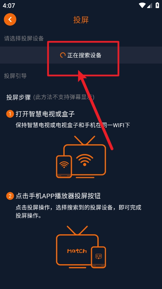 5、进行搜素连接电视设备后,即可进行播放,手机和电视需要在同一网络下。