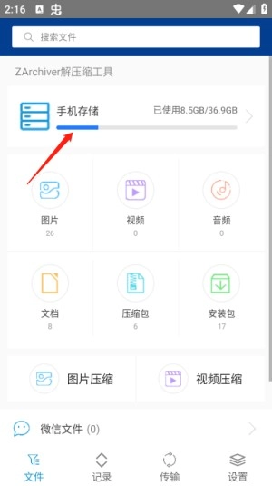 1、点击本站提供的Zarchiver Pro绿色版,进入文件界面后,选择手机存储选项。