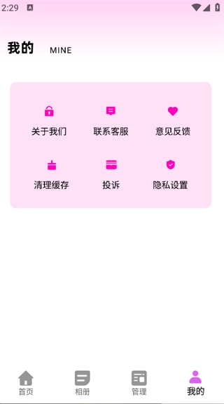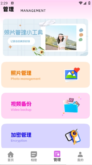 点击页面下方的“管理”按钮,就能看到照片管理、视频备份、加密管理等功能选项。